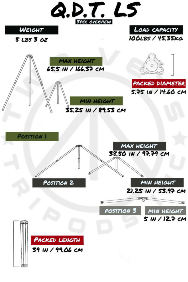 The Q.D.T LS tripod is truly a gamers tripod. This Tripods’ sole purpose is to give those shooters a competitive edge when shooting matches. It features a quick deployment system with 2 leg sections, new ratcheting locking tabs for even faster deployment. With the popularity of our QDT we wanted to add in a couple new KEY FEATURES. The QDT LS features a leg stopper that does not allow legs to cross when transporting. We have also added a single padded leg to make it easier to transport and a comfortable grip when shooting the tripod.